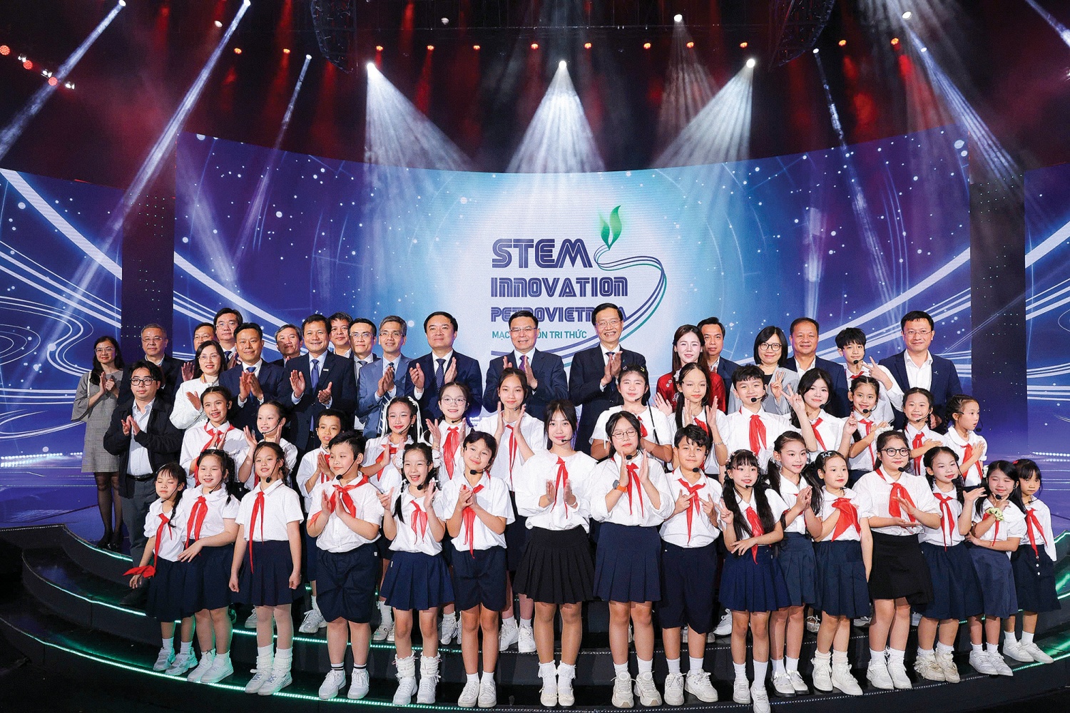 Đồng chí Lê Mạnh Hùng, Ủy viên Trung ương Đảng, Quyền Bộ trưởng Bộ Công Thương; đồng chí Lê Ngọc Sơn, Chủ tịch HĐTV Petrovietnam; đồng chí Trần Quang Dũng, Phó Bí thư Thường trực Đảng ủy Tập đoàn và các em học sinh tham dự chương trình cầu truyền hình trực tiếp “Mạch nguồn tri thức - STEM Innovation Petrovietnam”