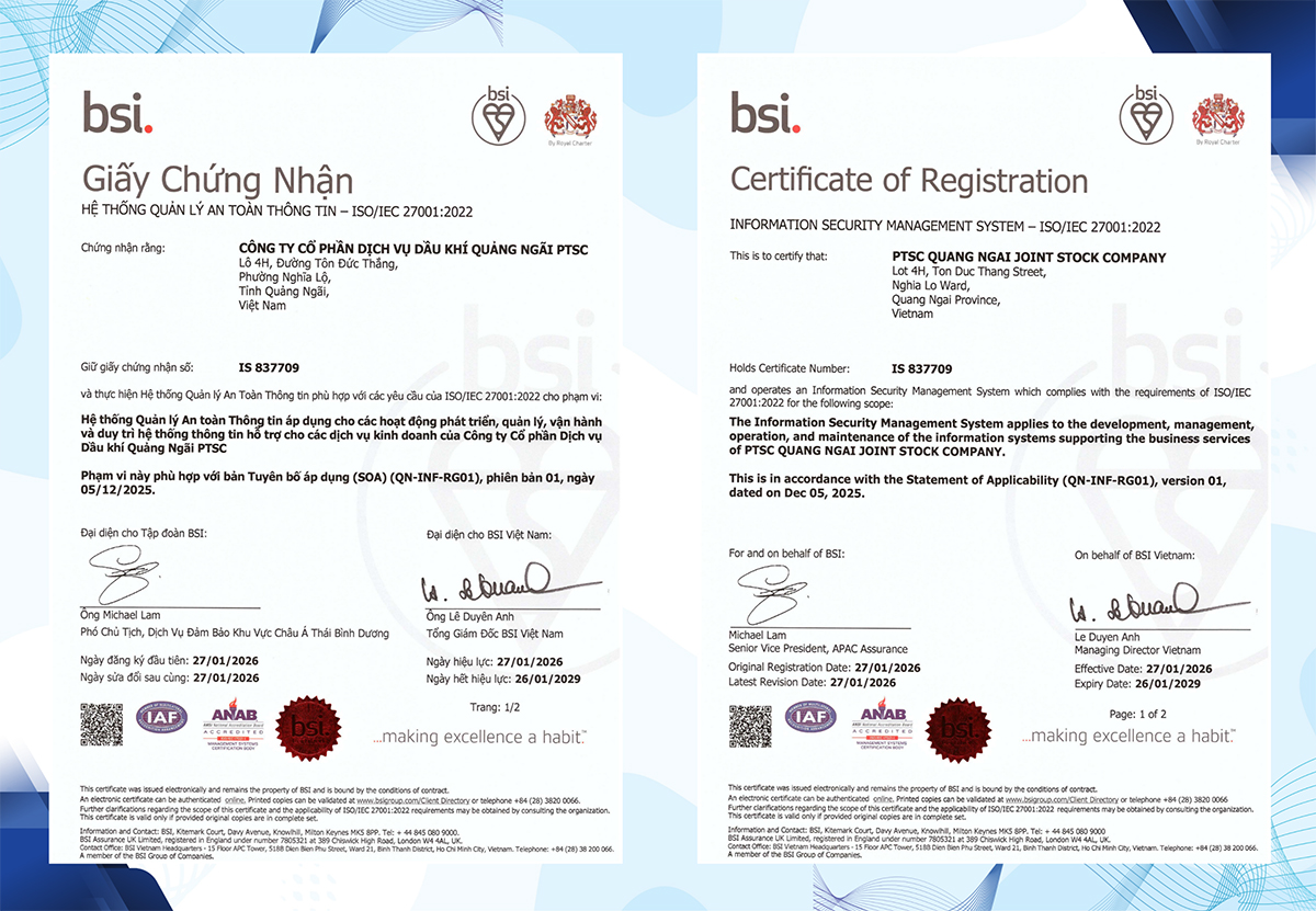 Kết quả của quá trình triển khai nghiêm túc và đồng bộ đã được ghi nhận khi Hệ thống Quản lý An toàn Thông tin (ISMS) của PTSC Quảng Ngãi chính thức đạt chứng nhận ISO/IEC 27001:2022, sau khi hoàn thành các kỳ đánh giá theo yêu cầu của tổ chức chứng nhận.