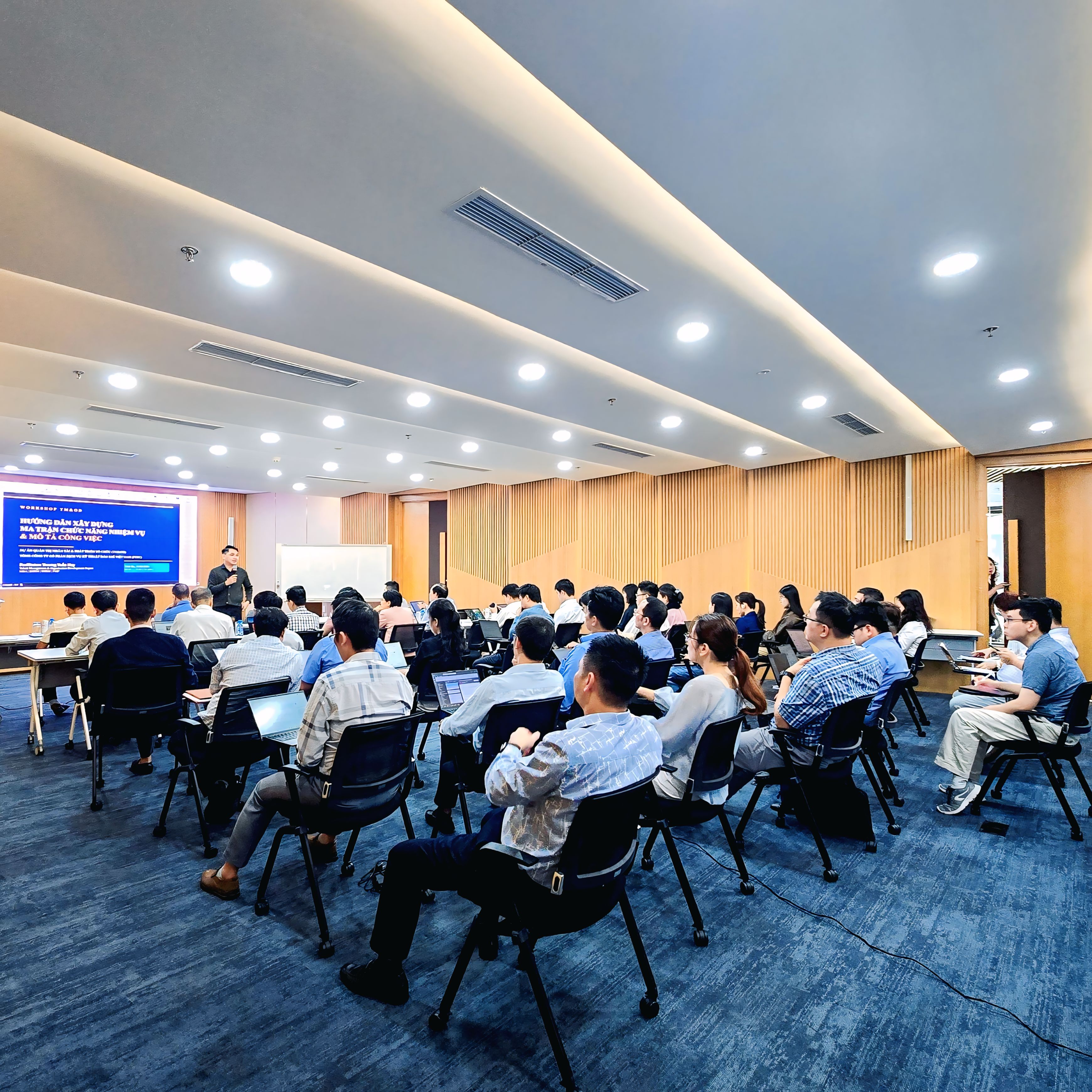 Một trong những điểm nhấn tạo nên sự khác biệt của Workshop lần này chính là phần thực hành nhóm chuyên sâu. Các học viên được chia thành nhiều nhóm nhỏ theo đơn vị, trực tiếp xây dựng Ma trận Chức năng Nhiệm vụ và Mô tả Công việc cho chính bộ phận mình dưới sự hướng dẫn và phản hồi liên tục từ chuyên gia. Đây không chỉ là bài tập lý thuyết mà là quá trình hoàn thiện tài liệu thực tế, với sự trao đổi, chỉnh sửa và cập nhật ngay tại lớp học. Nhờ đó, học viên không chỉ hiểu rõ về mặt lý thuyết mà còn có thể áp dụng ngay vào công việc, đồng thời mang về những bộ tài liệu đã được kiểm duyệt chất lượng.